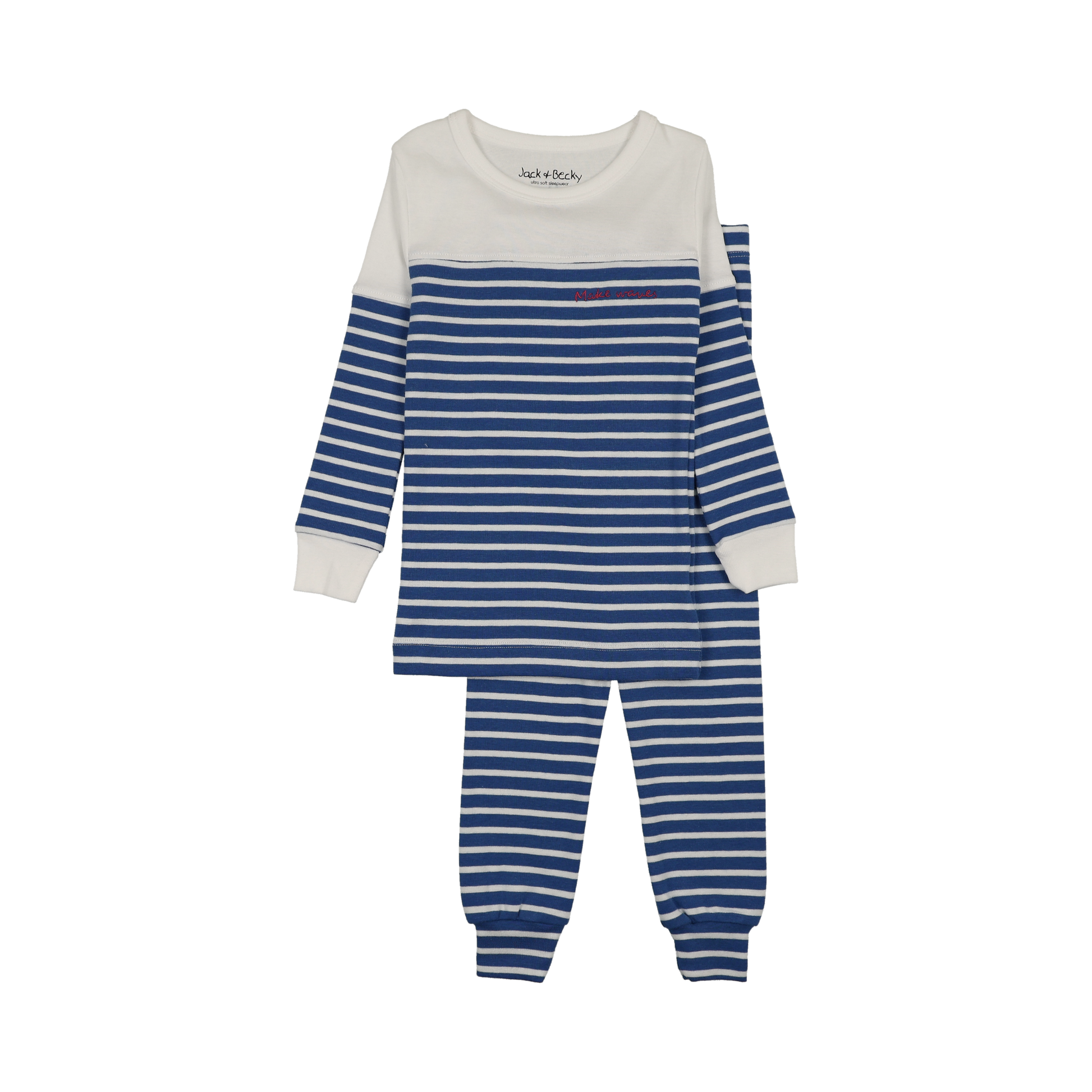 Our Make Waves PJs are crafted from ultra-soft fabric and designed with bold blue stripes and crisp contrast trim. Finished with a playful embroidered detail, they bring classic style with a fun twist.